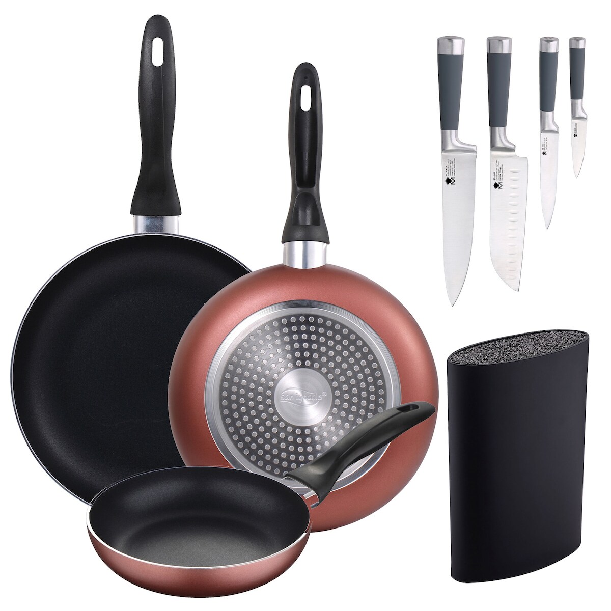 San Ignacio - 3er-Set Ø16/20/24 cm Bratpfannen aus gepresstem Aluminium für Induktion mit 4 Küchenmessern und Universalhalter