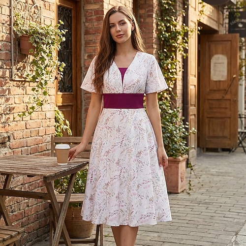 Anni 1950 Rockabilly Midi Vestito Maniche corte Floreale Linea ad A Collo quadrato Costume Per donna Casuale Abbigliamento Quotidiano Tè Adulti Vestito Primavera Estate