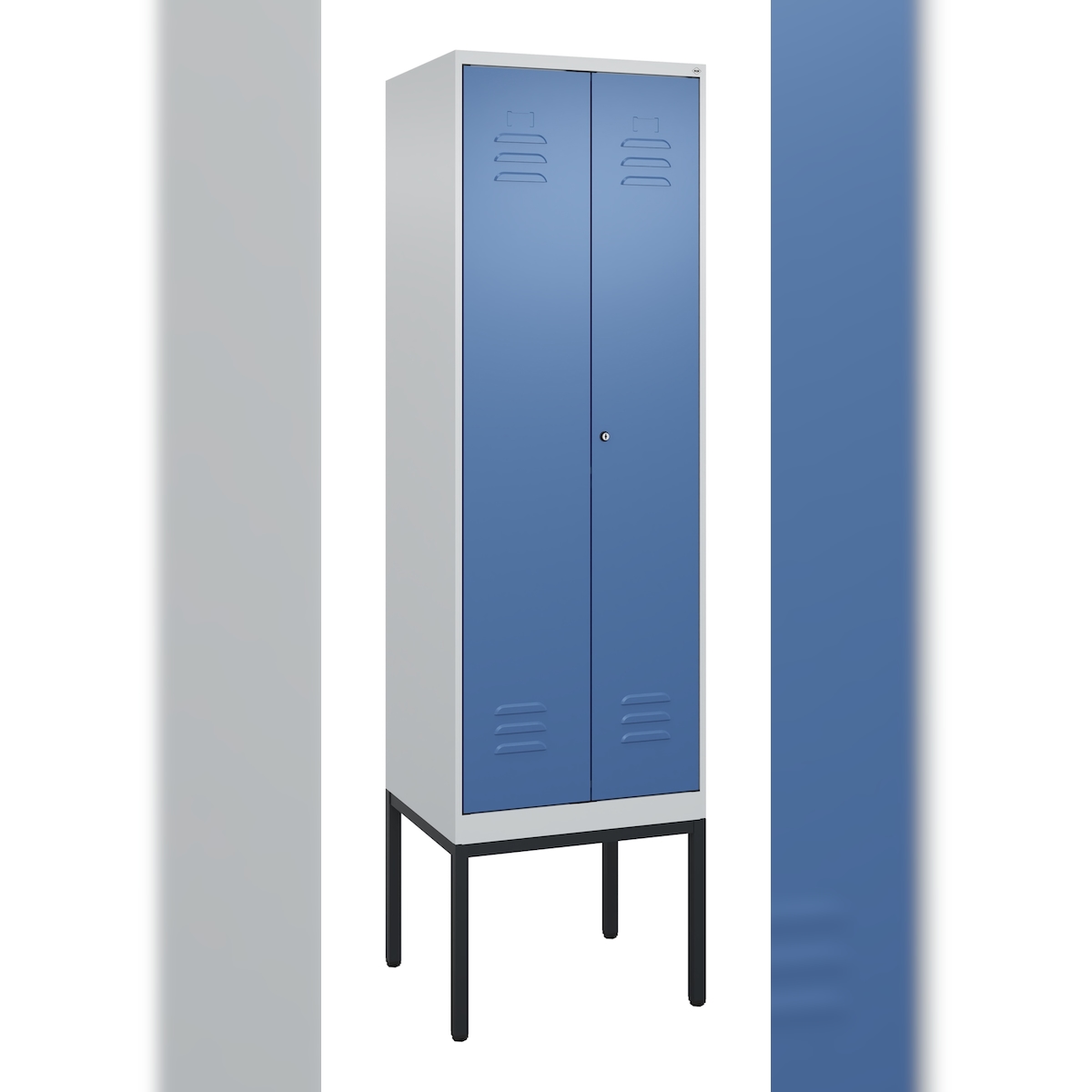 Schwarz-Weiß-Spind Classic PLUS, Trennwand mittig, 1 Abteil, lichtgrau / enzianblau, HxB 1950 x 600 mm, mit Füßen, Drehriegel C+P