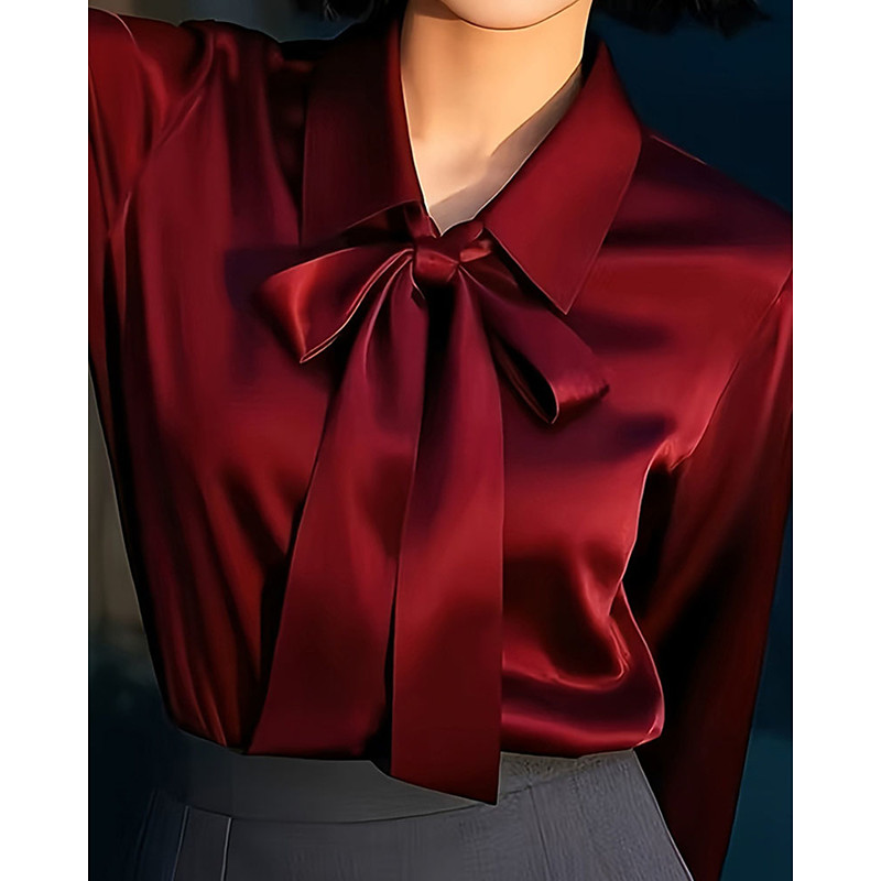 Women's Blouse Dressy Tops Plain Elegant Vintage Stylish Long Sleeve Tie Neck Regular Tops Daily Work Holiday Ruched Tie Front Patchwork Wine Spring Fall