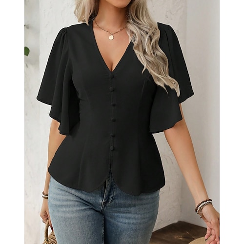 Per donna Camicia Blusa Semplice Elegante Moderno Manica Lunga Scollo a V Top Regolari Quotidiano Ferie Uscire Bottoni Nero Vino Verde militare Marrone chiaro Marrone Estate Primavera