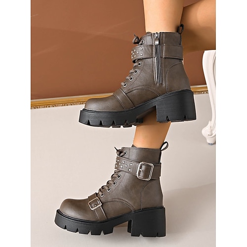 Per donna Stivali Stivali da Combattimento Quotidiano Tronchetti Lacci Tacco grosso Punta Tonda Casual Finta Pelle Cerniera Marrone chiaro Nero Grigio