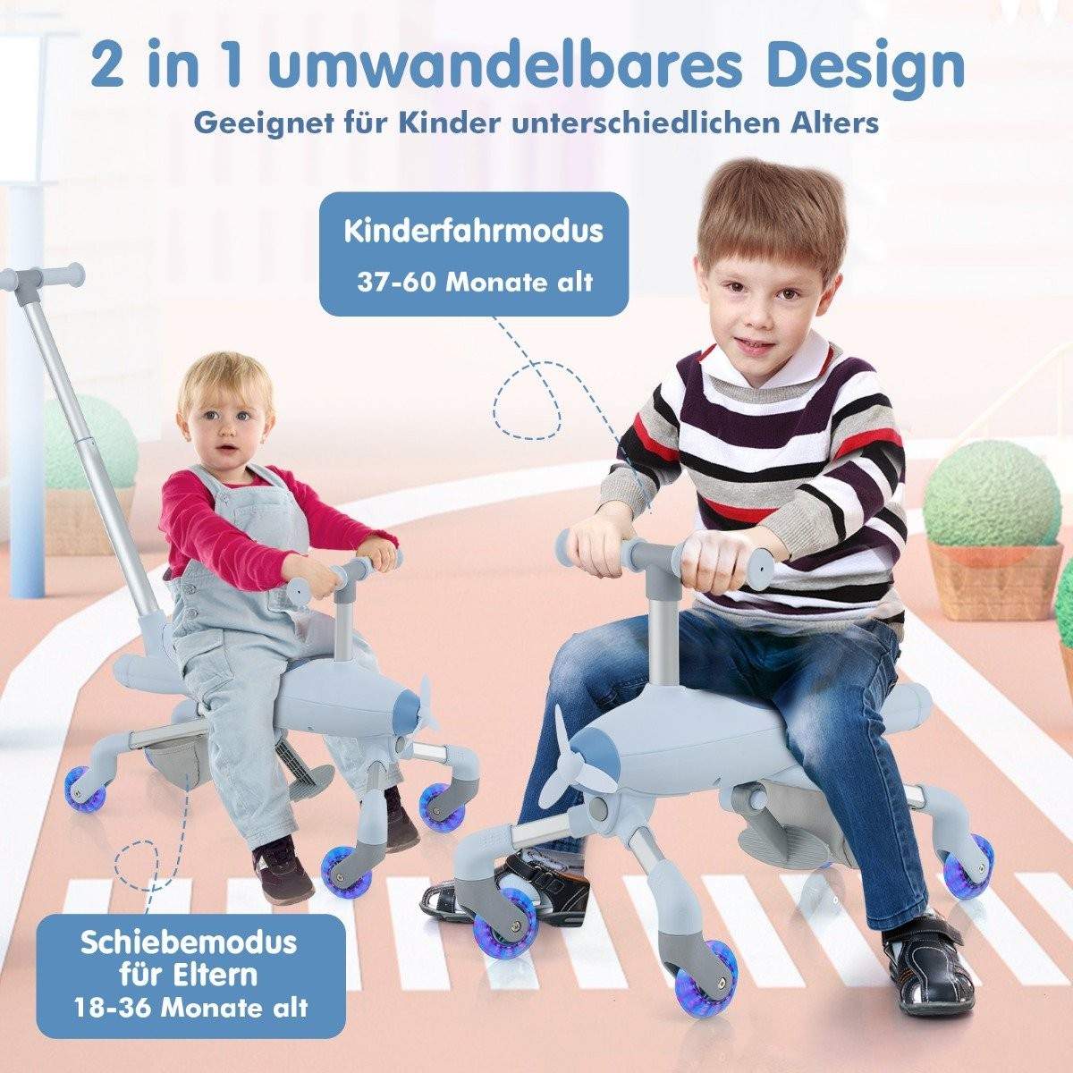 2-in-1 työntöauto lapsille Työntöauto lentokoneessa LED-valaistuilla renkailla, kannettava jopa 50 kg siniseen