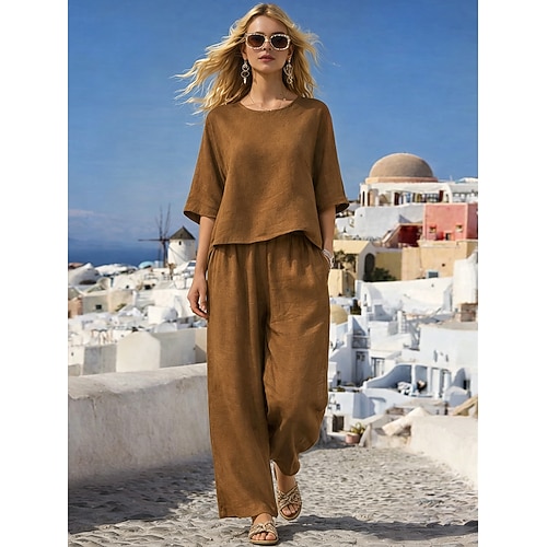 Per donna Camicia Set di biancheria in cotone Set da due pezzi Pantaloni di Lino Pantaloni Manica Corta Girocollo Tinta unica Coulisse Moda Streetwear Abbigliamento quotidiano Data Nero Giallo Grigio