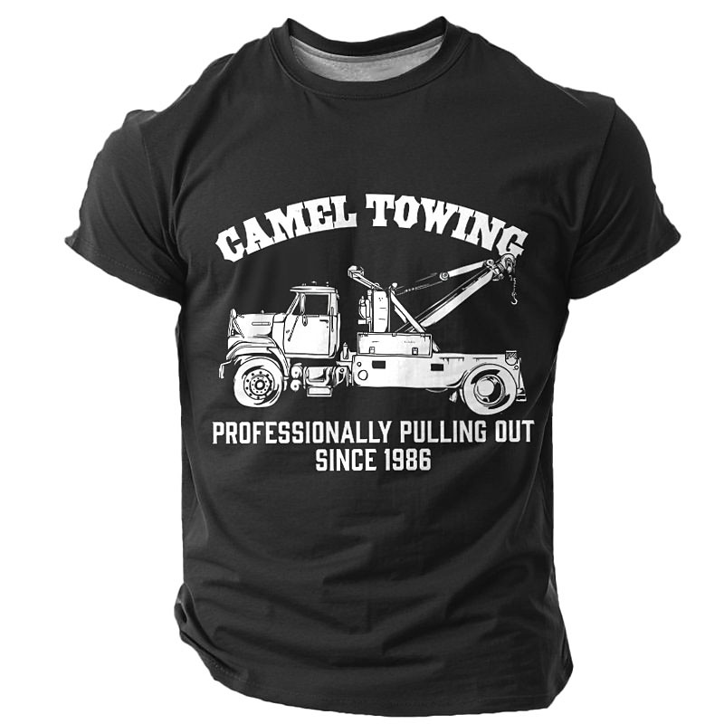 Men's Humorous Tow Truck T-Shirt - 'Camel Towing Professionally Pulling Out Since 1986' Graphic Tee
