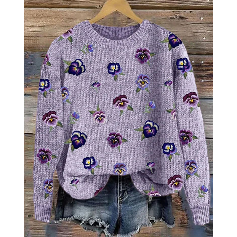 Women's Sweater Casual Soft Floral Graphic Ribbed Crew Neck Knitted Print Long Sleeve Regular Tops Knit Outdoor Daily Weekend Pink Fuchsia Fall Winter
