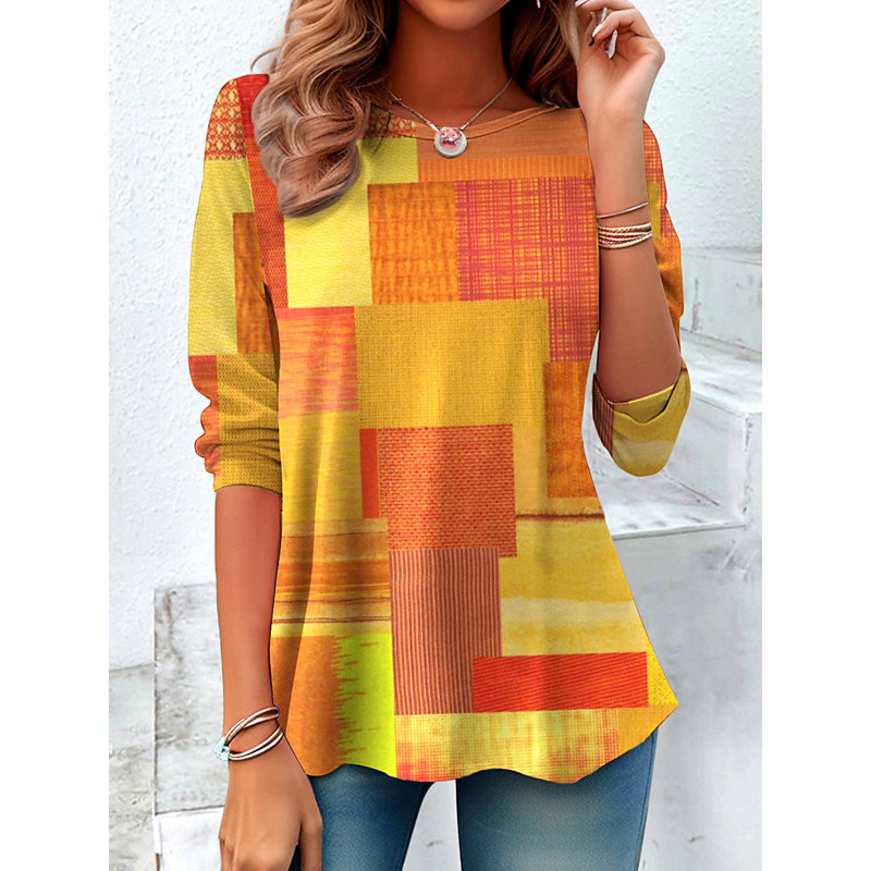Women's T Shirt Graphic Geometric Vintage Fashion Stylish Long Sleeve Crew Neck Round Neck Regular Tops Daily Weekend Print Blue Red Orange Summer Spring Fall