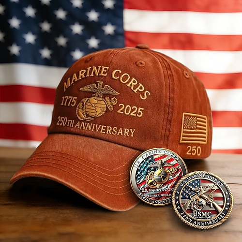 Cappellino da baseball retrò lavato in onore del 250° anniversario dei Marines degli Stati Uniti con 2 monete commemorative, cappello vintage ricamato per il 250° anniversario dei Marines degli Stati