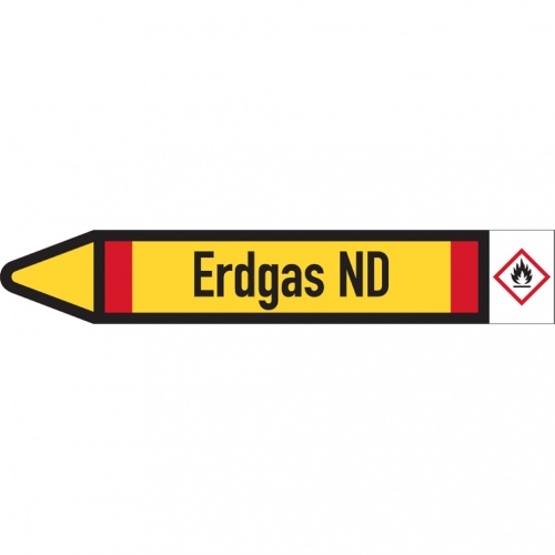 Dreifke® Rohrleitungskennzeichen-Etikett Erdgas ND, links, DIN, gelb/schwarz/rot, für Ø 25-40mm, 154x26mm, 5/Bogen