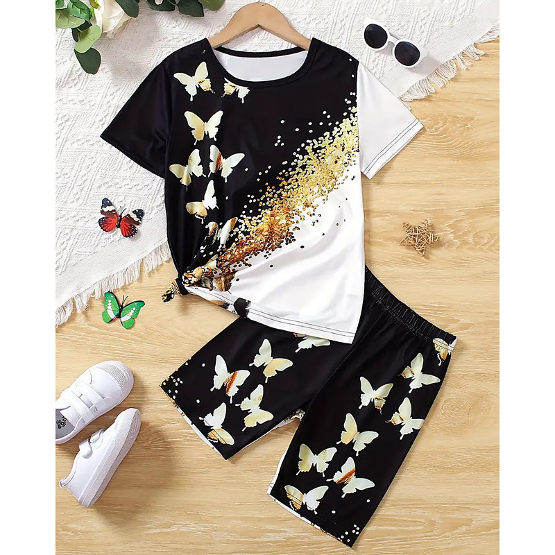 Girls' 3D Graphic Butterfly T-shirt Shorts Set Short Sleeve Summer Spring Sports Fashion Daily Kids 4-12 Years Crew Neck Outdoor Vacation Sports Tailored Fit