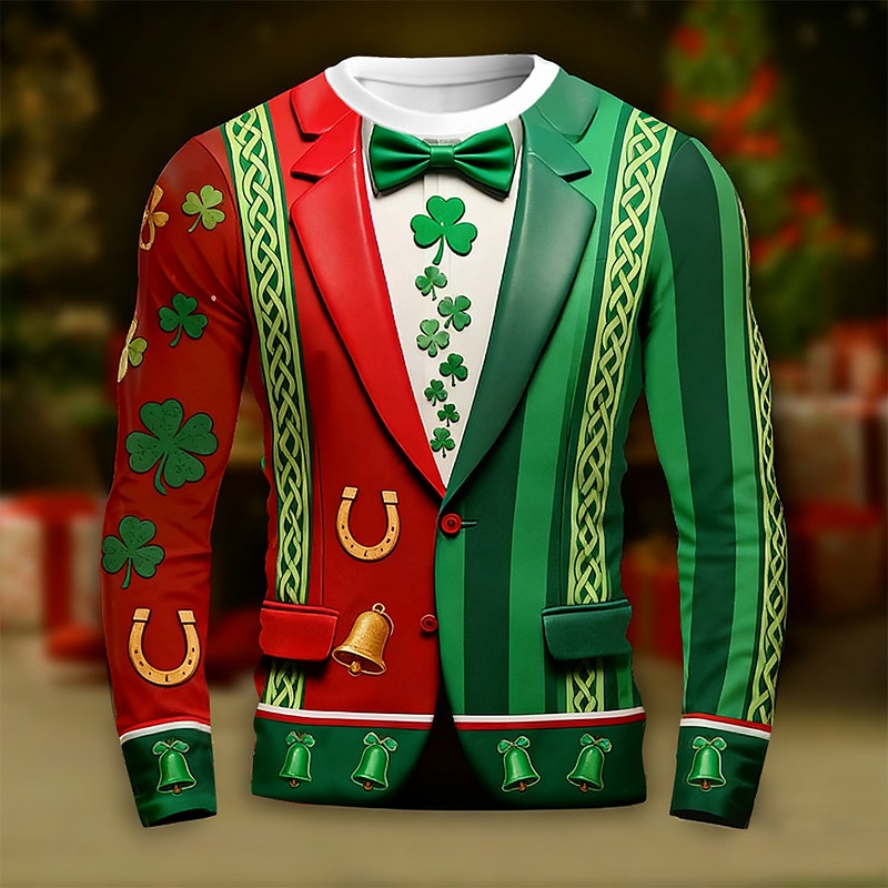 St. Patrick Men's Shamrock Lucky Irish Tuxedo T Shirt Long Sleeve T shirt 3D Print Crew Neck Shirt Exaggerated Designer 3D Vacation Party Street Red Orange Summer Spring Fall Clothing Apparel S M L