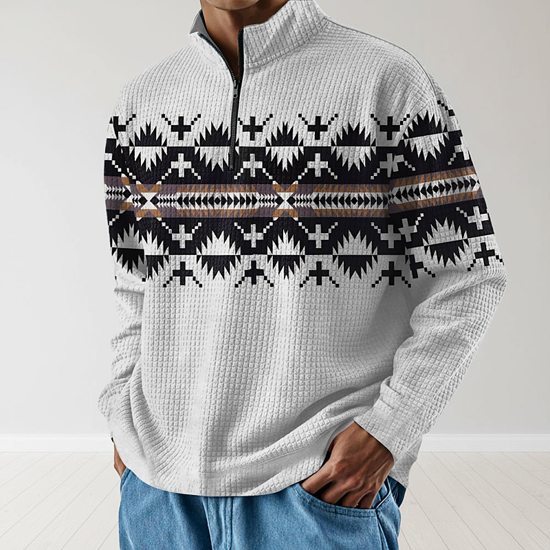 Men's Geometric Waffle Hoodie Sweatshirt Fashion Daily Ethnic Long Sleeve Stand Collar Quarter Zip Outdoor Home Office Work White Red Blue Brown Zip Up Fall Winter Designer S M L XL XXL XXXL
