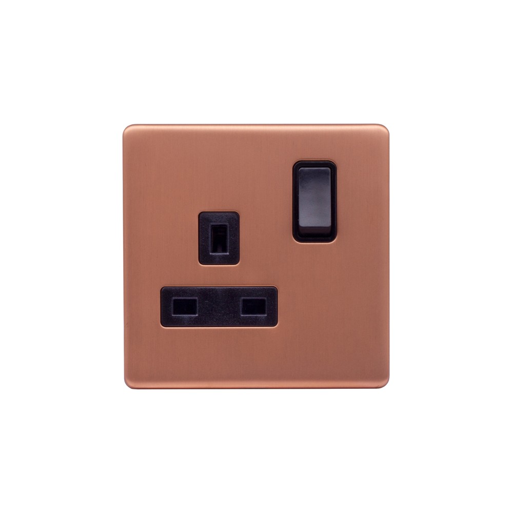 Lieber Brushed Copper 13A 1 Gang Switched Socket - Double Pole - Black Insert Screwless - Size: 86mm x 86mm x 2.65 mm