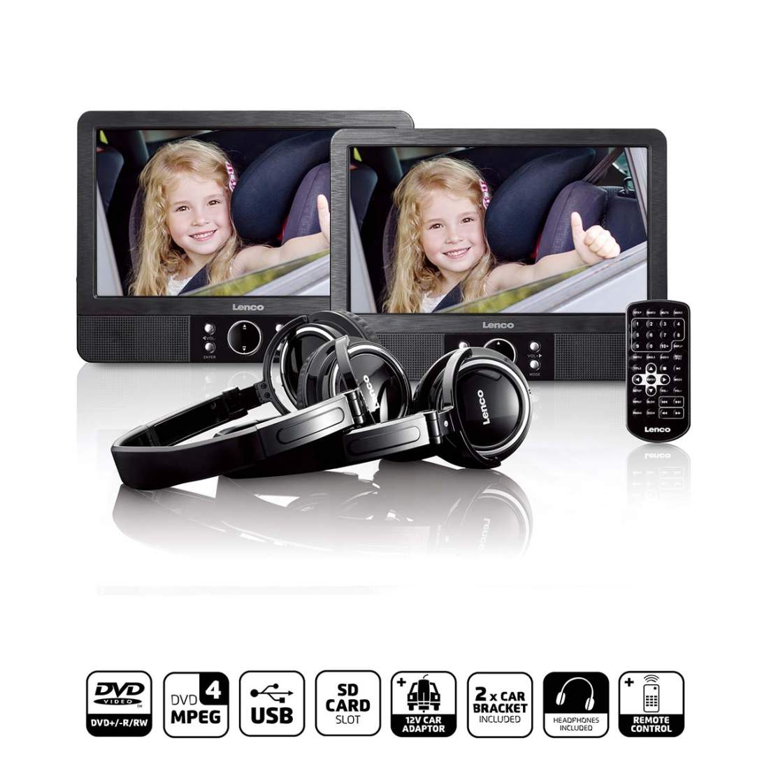 9 tuuman DVD-kaksoisnäyttö kiinnikkeillä ja kuulokkeilla musta