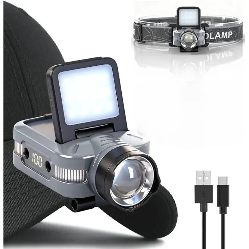 faro girevole versatile con spia rossa di avvertimento stoppino laser bianco, raggio regolabile a 90°, ricarica USB-C, clip per cappello a mani libere per lavori all'aperto, escursionismo ed