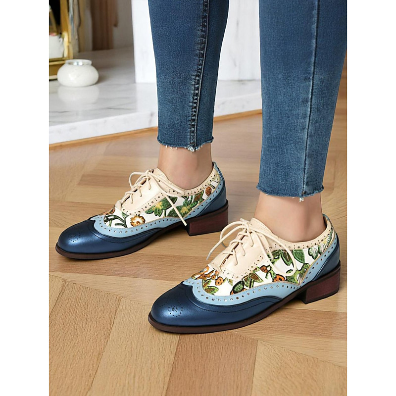 Women's Floral Embroidered Oxford Shoes – 1950s Vintage Lace-Up Faux Leather Flats for Daily Wear, Tea Parties Garden Walks