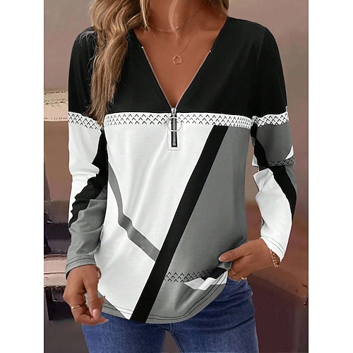 Per donna Maglietta Grafico Geometrico Moda Casual Manica Lunga Girocollo Scollo a V Top Regolari Quotidiano Cerniera Stampato Nero Rosso Blu Primavera Autunno Inverno