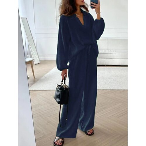 set da donna in cotone, set di pantaloni in 100% cotone, manica lunga, colletto della camicia, tinta unita, coulisse, elegante, moda, streetwear, casual, quotidiano, all'aperto, nero, bianco, rosa,