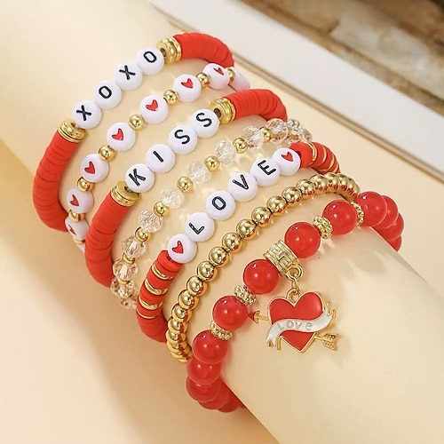 6 Stück Valentinstag Armband rote Herz Polymer-Clay Acryl LIEBE Brief Perlen Armband Set süßes Schichten Armband-Pack für Frauen Party-Bekleidungszubehör süße Geschenkwahl für Freundin