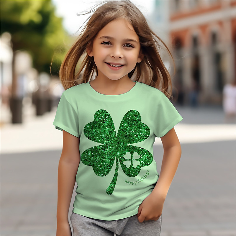 St. Patrick Girls' 3D Four Leaf Clover Tee Shirts Short Sleeve 3D Print Summer Active Fashion Cute Polyester Kids 3-12 Years Crew Neck Outdoor Casual Daily Regular Fit