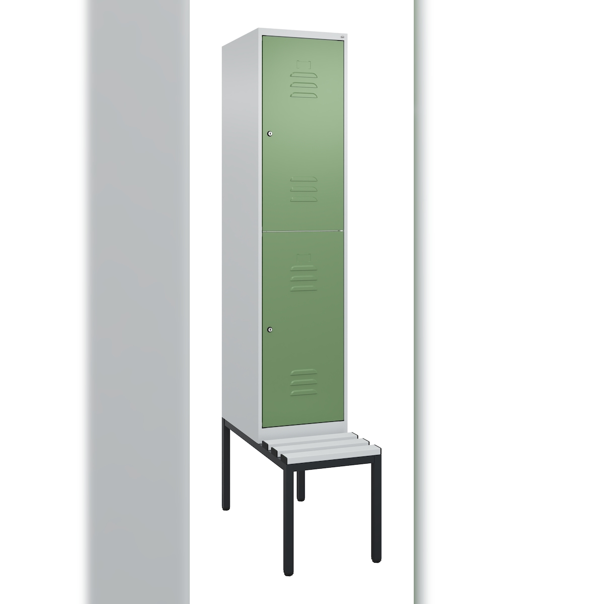 C+P Spind Classic PLUS, Füßen, 2 Abteile, HxBxT 195x25x50cm, Sicherheitsdrehriegel, Hellgrau/Resedagrün von PROREGAL