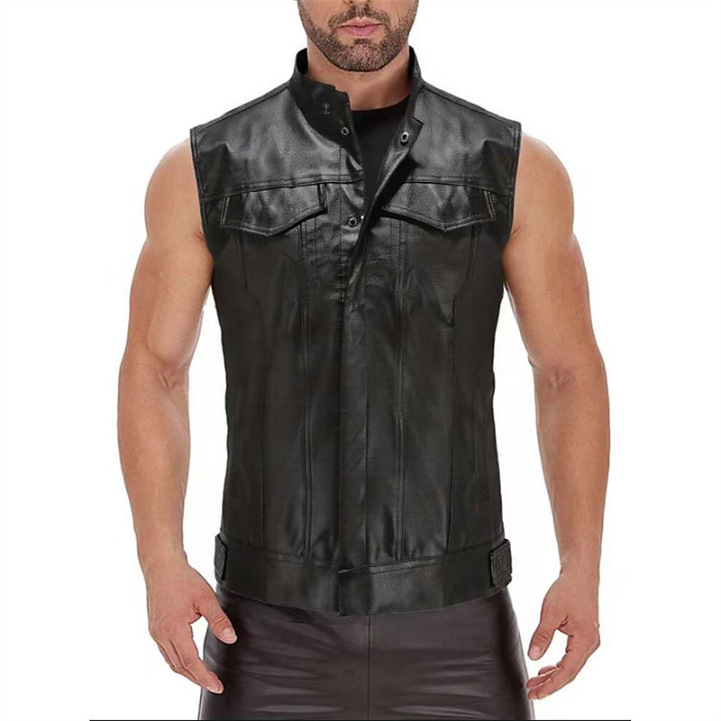 Men's Vest Gilet Faux Leather Vest Outdoor Daily Fashion Casual Spring Fall Pocket Faux Leather Comfortable Plain Zipper Stand Collar Regular Fit Black Vest