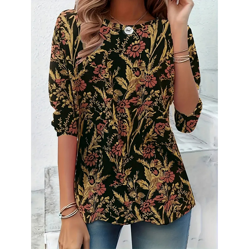 Women's T Shirt Floral Graphic Plants Vintage Stylish Classic Long Sleeve Crew Neck Round Neck Regular Tops Daily Print Black Spring Fall Winter