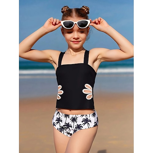 Bambini Ragazze Costume da bagno All'aperto Spiaggia Grafico Foglia Vacanza Tropicale Sport Traforato Costumi da bagno Dai 4 anni in su Estate Bianco e nero Nero