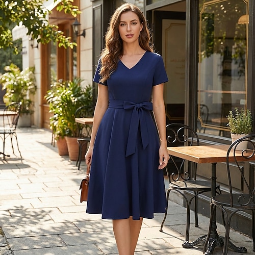 Elegante Anni 1950 Midi Vestito Maniche corte Tinta unica Semplice Linea ad A Scollo a V Costume Per donna Casuale Feste Abbigliamento Quotidiano Adulti Vestito Primavera Estate