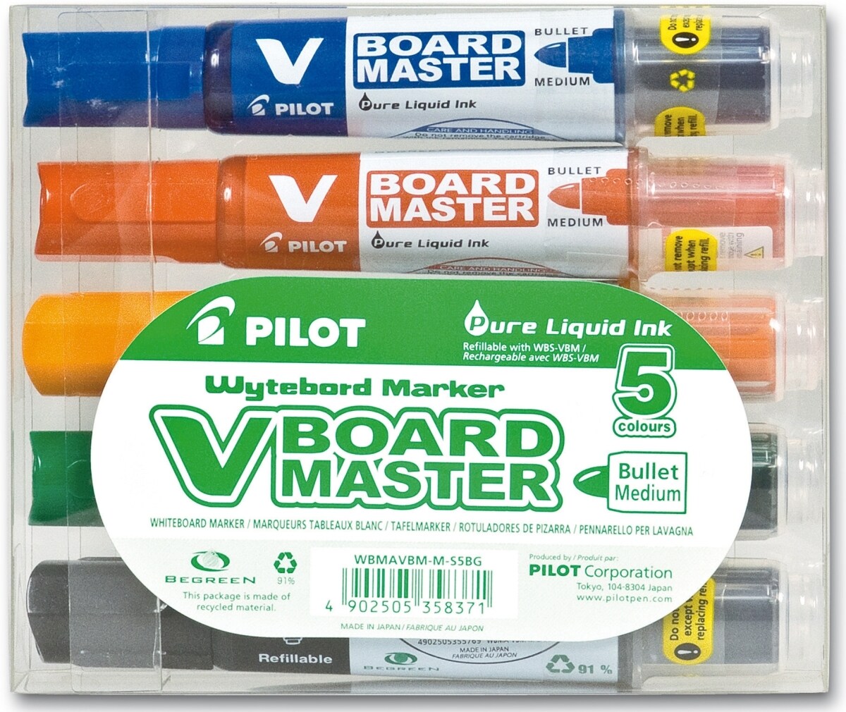 Pilot Boardmarker V-Boardmaster Begreen Set 5 Farben + Tafelwischer Packung mit 10 Stück
