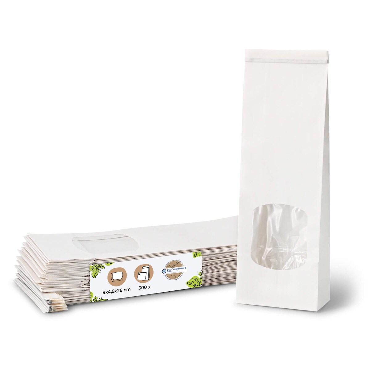 BIOZOYG 500 Stück Kraftpapiertüten 9 x 4,5 x 26 cm, Größe S, weiß, Papiersäckchen, Blockbeutel, mit Fenster, Papier-Geschenktüten mit Clip