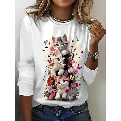 Per donna Maglietta Floreale Grafico Gatto Moda Elegante Classico Manica Lunga Girocollo Top Regolari Quotidiano Stampato Marrone rossastro Bianco Rosa Estate Primavera Autunno Inverno