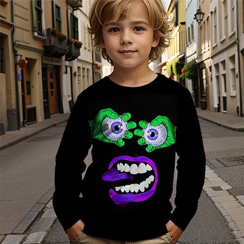 Halloween Jungen 3D Grafik T-Shirt Langarm Frühling Herbst Mode Basic Kinder 4-12 Jahre Rundhalsausschnitt Outdoor Lässig Täglich Normale Passform