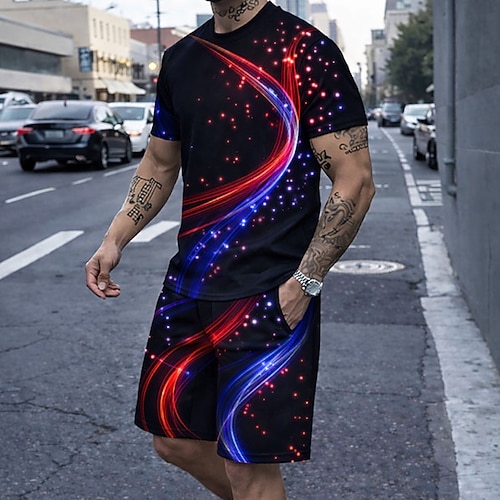 Herren Geometrisch Linie 2St T-Shirts-Sets Sommeroberteile Kurzarm Kurze Hosen Rundhalsausschnitt Streetstyle Lässig Täglich Urlaub 3D-Druck Sommer Schwarz Rote Purpur