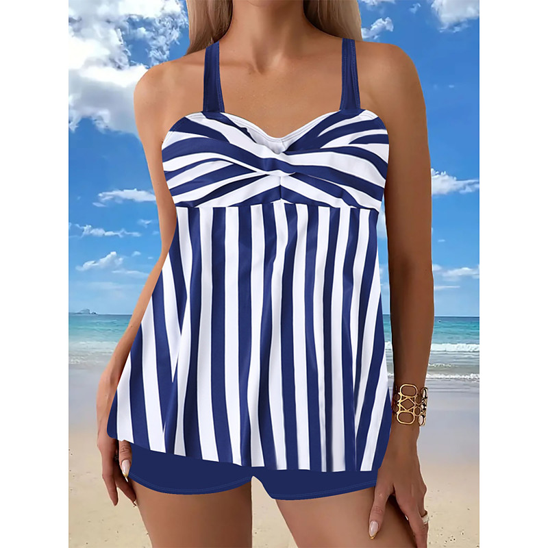Women's Tankini 2 Piece Swimsuit Shorts Tummy Control High Waist Slim Backless Vacation Beach Wear Geometric Striped V Neck Sleeveless Bathing Suits
