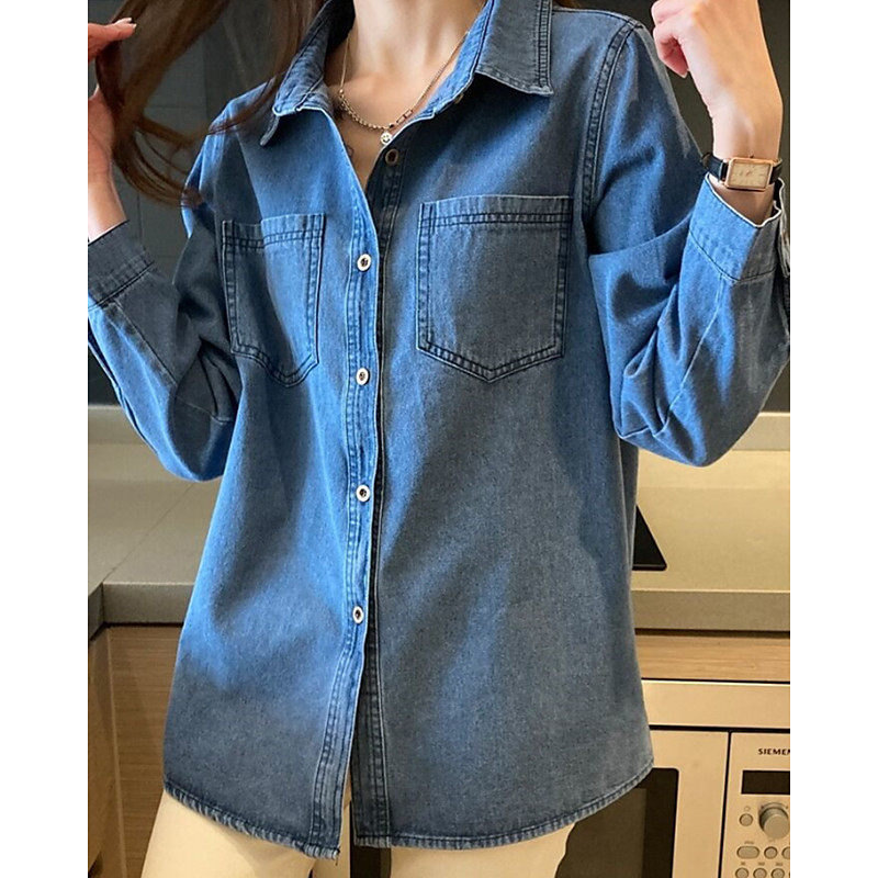 Women's Shirt Blouse Plain Casual Long Sleeve Shirt Collar Regular Tops Holiday Going out Pocket Buttons Blue Spring Fall