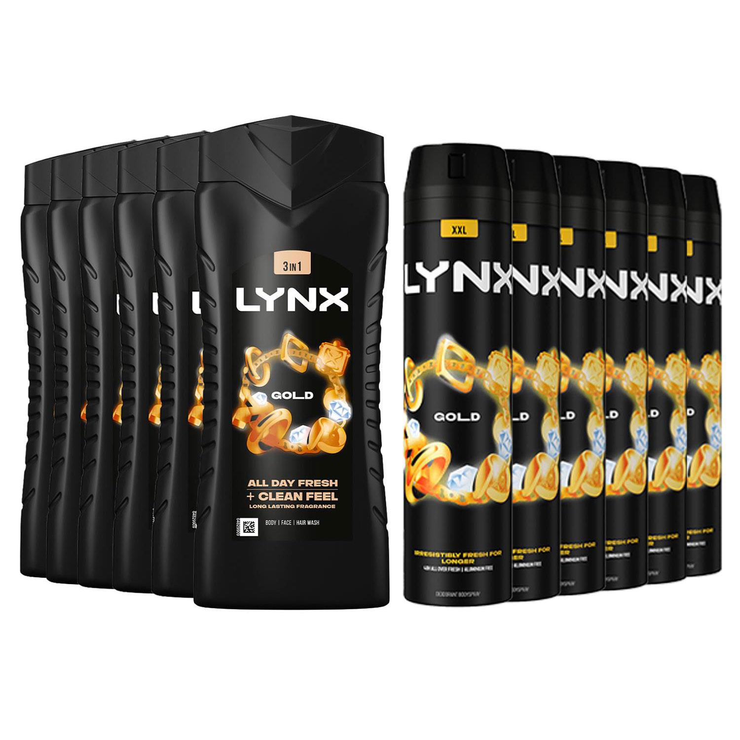 Lynx Mens 6x Each Gold 12H Refreshing Shower Gel 500 With 48H Fresh Body Spray 250ml - One Size | Lynx Sale | Discount Designer Brands