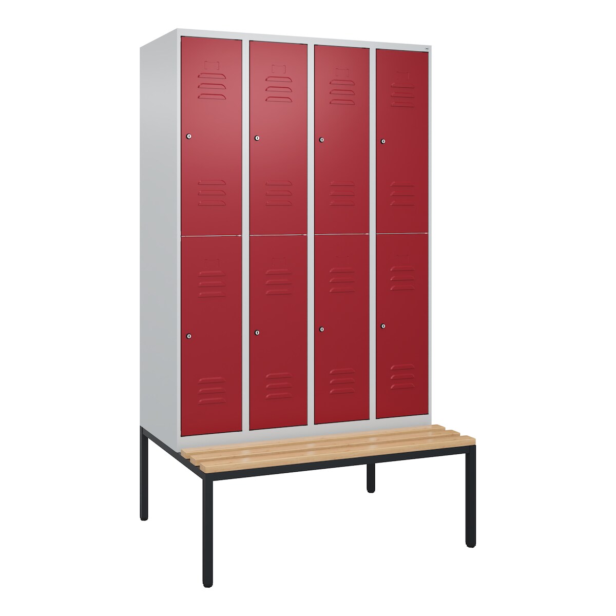 C+P Spind Classic PLUS, Buche untergebaute Sitzbank-Harthol, 8 Abteile, HxBxT 212x120x82cm, Zylinderschloss, Hellgrau/Rubinrot von PROREGAL