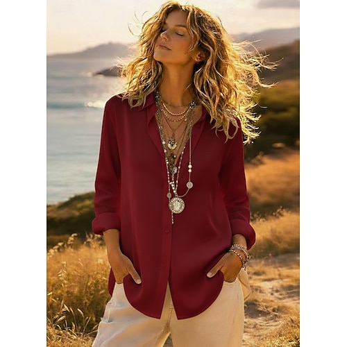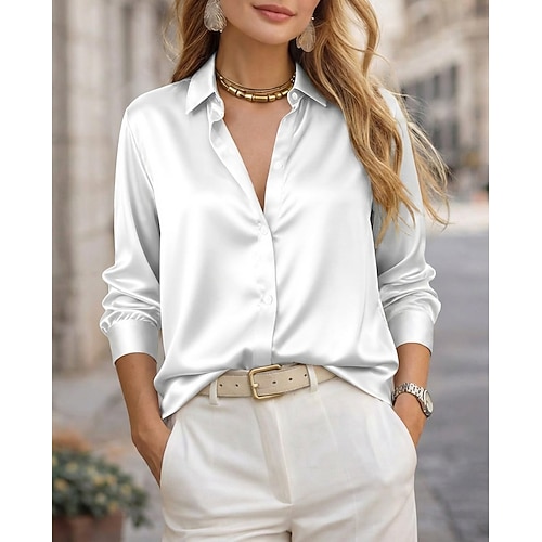 Per donna Camicia Top in raso Blusa Top Eleganti Arricciato Bottoni Drappeggiato Tinta unica Semplice Elegante Vintage Signore Manica Lunga Colletto a Camicia Top Regolari Quotidiano Ufficio Lavoro