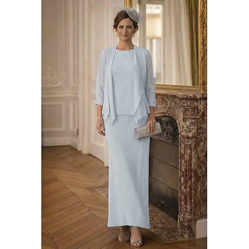 Due Pezzi Tubino Colonna Lunghezza al pavimento Abito da invitata a nozze Abito da cerimonia per signora Manica Lunga Scollo Tondo Elegante Formale Ospite di nozze Chiffon Con Stola con Tinta unita