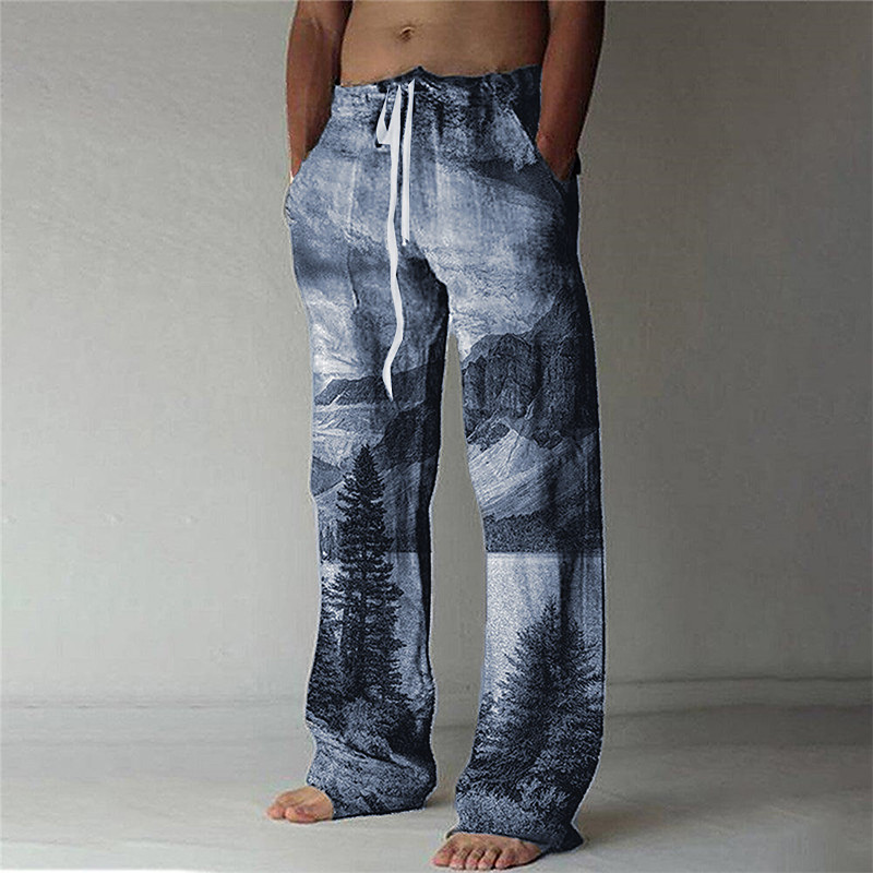 Men's Trousers Summer Pants Baggy Beach Pants Elastic Drawstring Design Front Pocket Straight Leg Tree Graphic Prints Comfort Soft Casual Daily For Vacation Linen Like Fabric Fashion Streetwear Blue