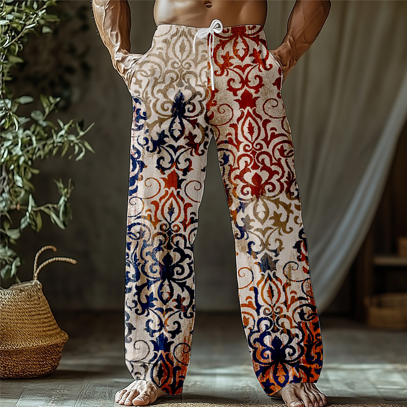 Men's Floral Print Flowers Trousers Baggy Pants Casual Pants Mid Waist Ethnic Style Retro Vintage Outdoor Vacation Drawstring Side Pockets Elastic Waist Summer Spring 3D Print Apricot