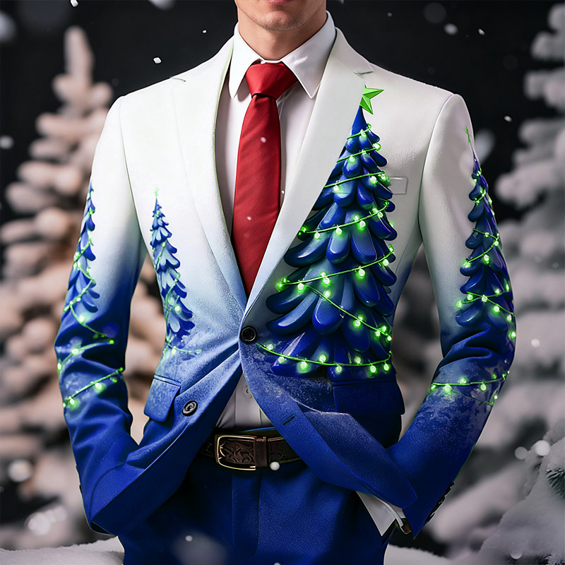 Men's Blazer Coat Christmas Casual Casual Daily Fall / Winter 100% Polyester Christmas Tree 3D Print Buttons Thermal Warm Comfortable Single Breasted Blazer Red Blue Purple Green