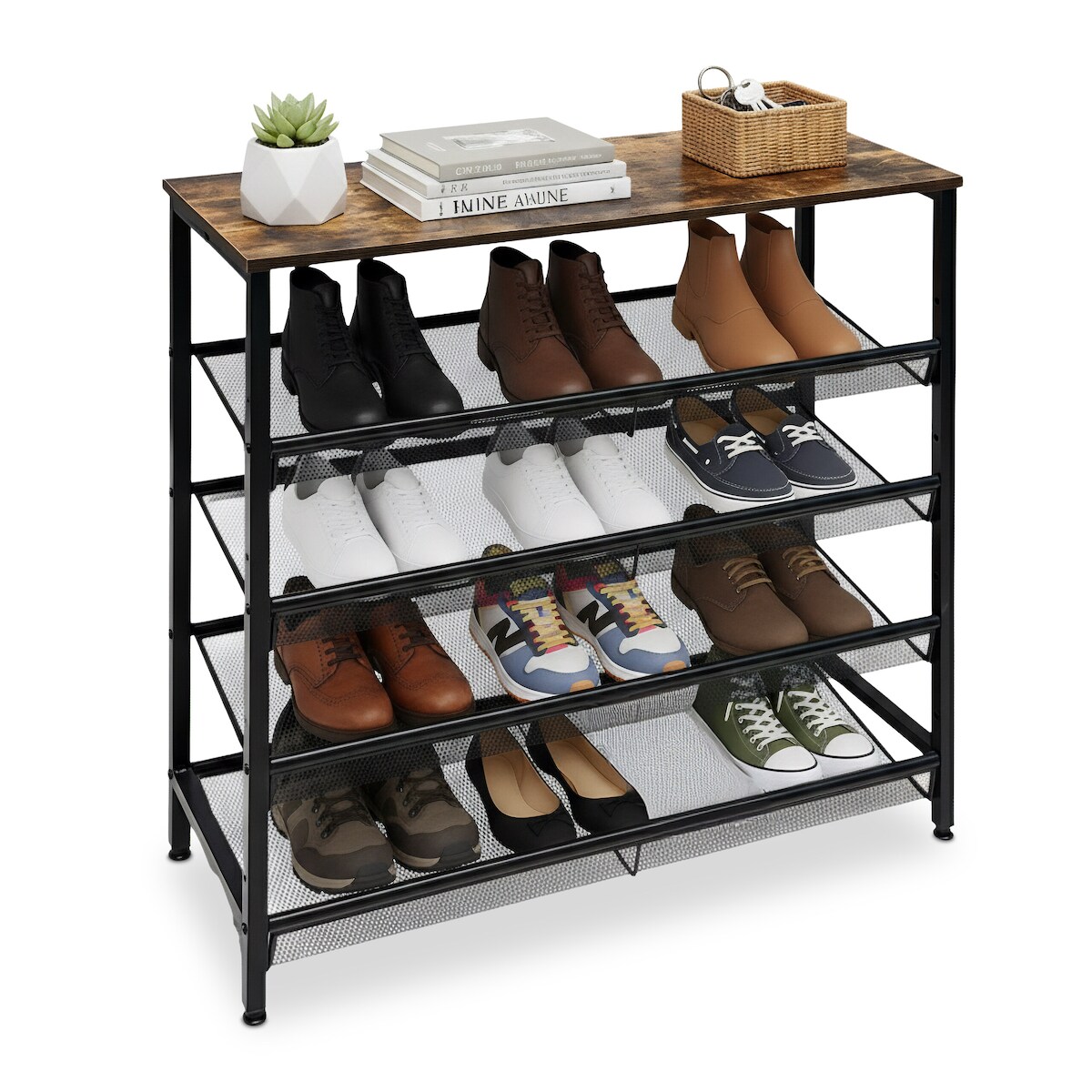 Relaxdays Schuhregal Industrial, 4 Gitterablagen, HBT: 85 x 80 x 30 cm, Schuhständer, Ablage in Holzoptik, schwarz/braun