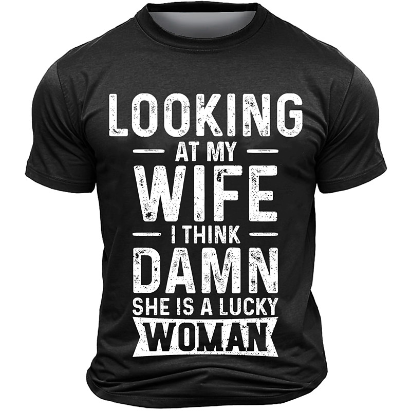 Men's Funny Graphic T-Shirt Short Sleeve, Husband Wife Marriage Quote: 'Looking At My Wife I Think Damn She Is A Lucky Woman'