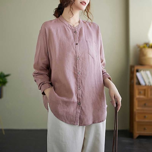 Per donna Camicie di cotone e lino Tinta unica Elegante Casual Manica Lunga Scollo a V Top Regolari Quotidiano Bottoni Bianco Rosa Rosso Blu Grigio Estate Primavera