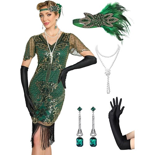 Set Anni Ruggenti Anni 1920 Abito da cocktail Lunghezza al ginocchio Abito Flapper Vestito Abiti con accessori Maniche corte Il grande Gatsby Charleston Paillettes Frangia con nappe Piuma Scollo a V