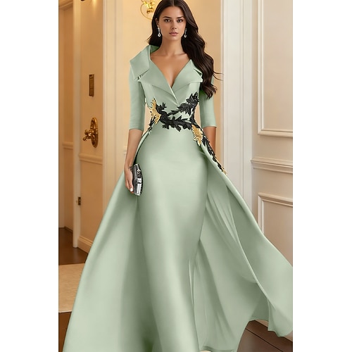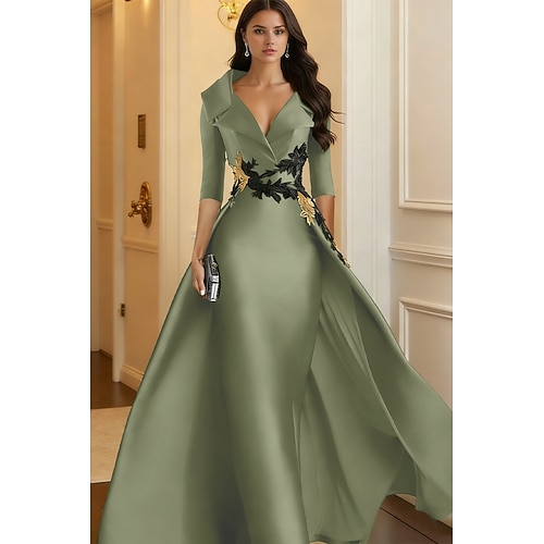 Linea ad A Lunghezza al pavimento Abito da Sera Elegante Manica 3/4 Colletto a Camicia Formale Raso con Applicazioni