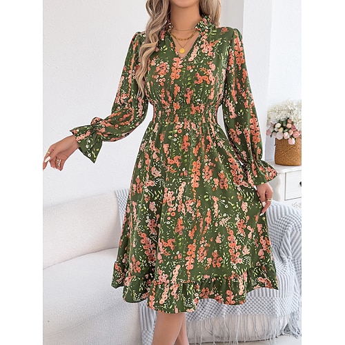 Per donna Abito Midi Abito a trapezio Vacanza Casual All'aperto Uscire Vestibilità standard Floreale Grafico Manica Lunga Scollo a V blu navy Nero Verde Estate Primavera Autunno