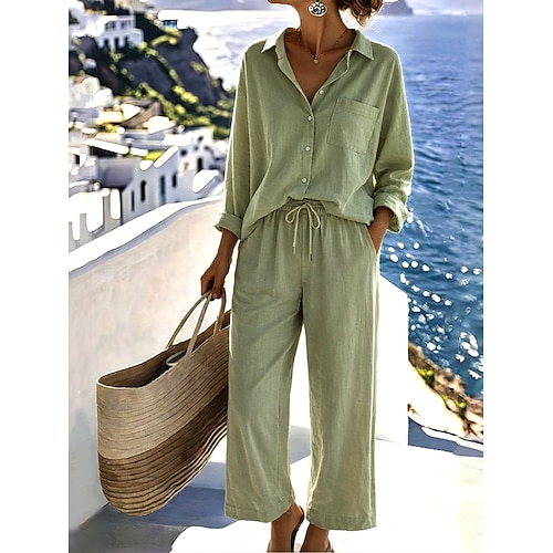 Set di pantaloni in cotone e lino da donna Bolero Top Camicia a maniche lunghe Colletto Colore solido Moda Streetwear Casuale Quotidiano Outdoor Blu Nero Bianco Estate Vestibilità ampia